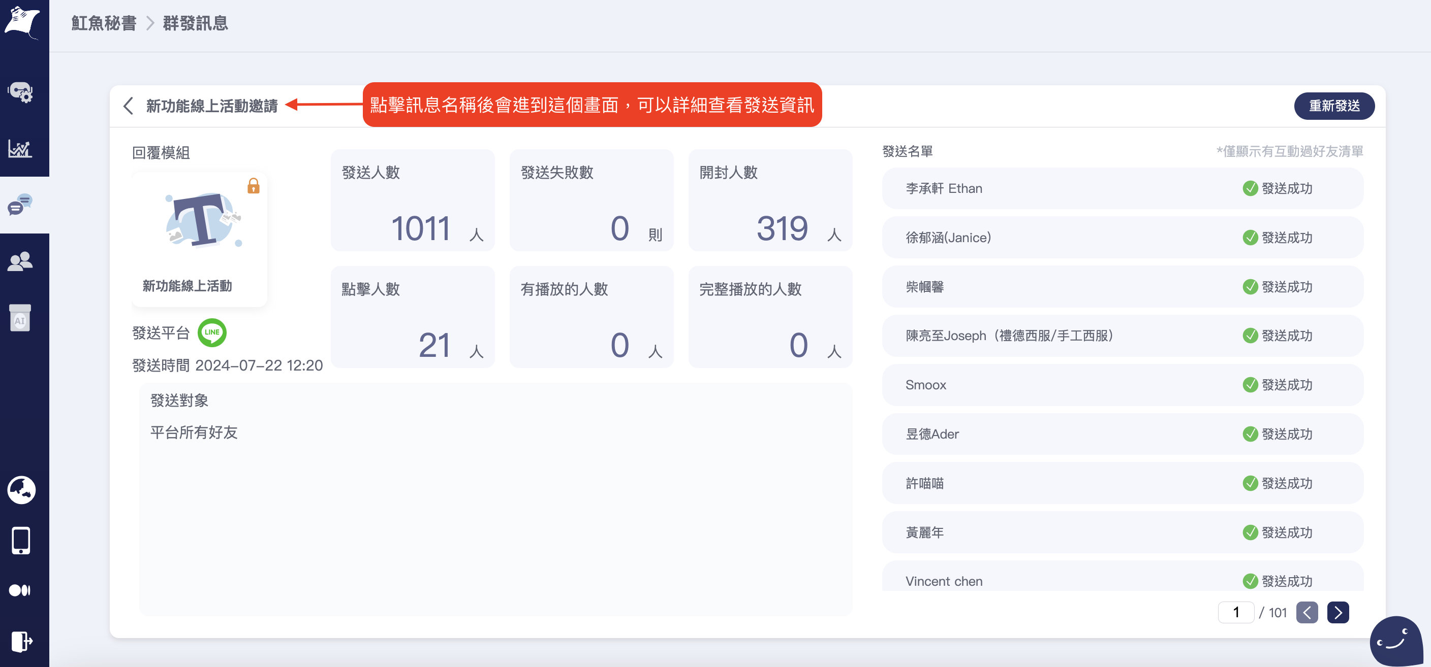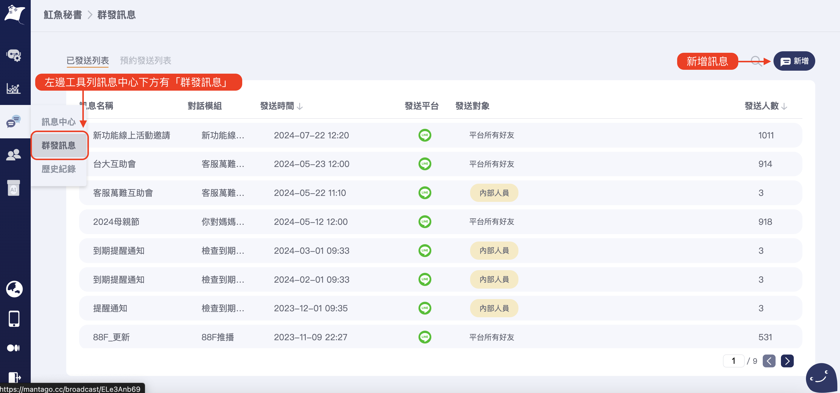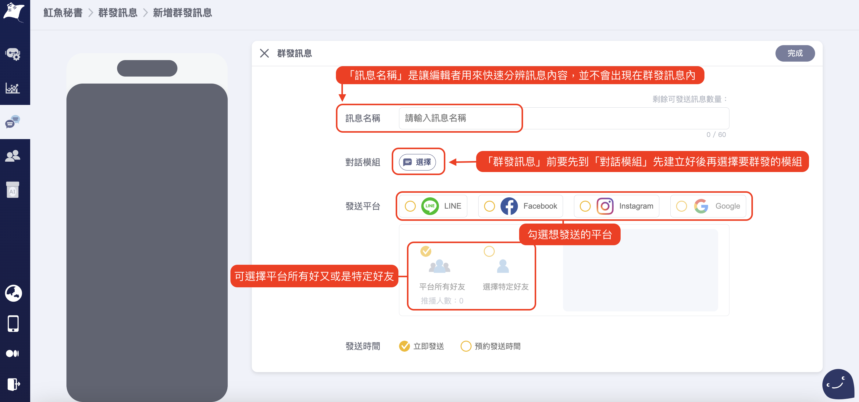對話模組和其他內容都設定好後，現在最重要的就是來推播給用戶啦～