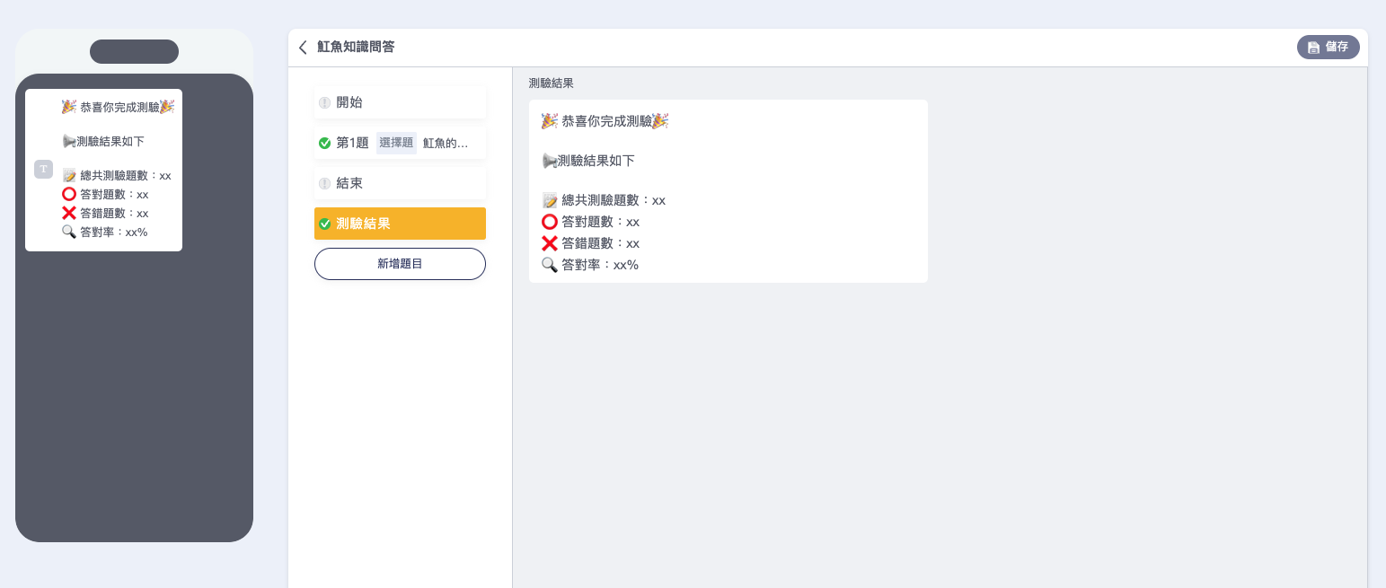 結束訊息小撇步： 建議在此輸入測驗題目的答案，可以讓使用者知道測驗的正確答案喔。