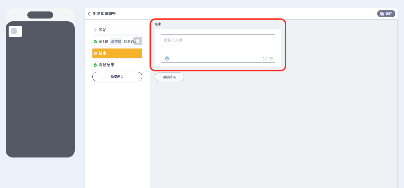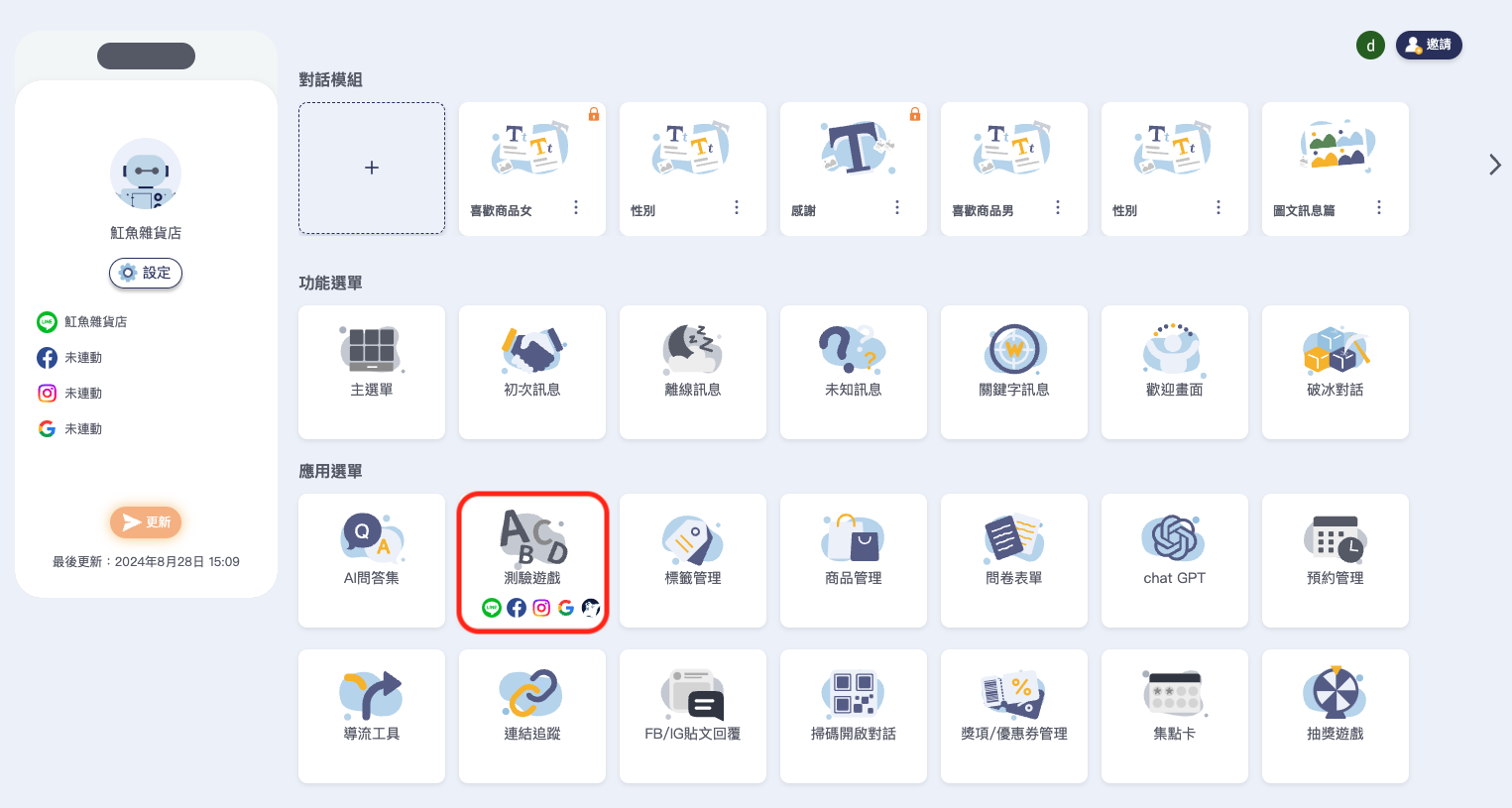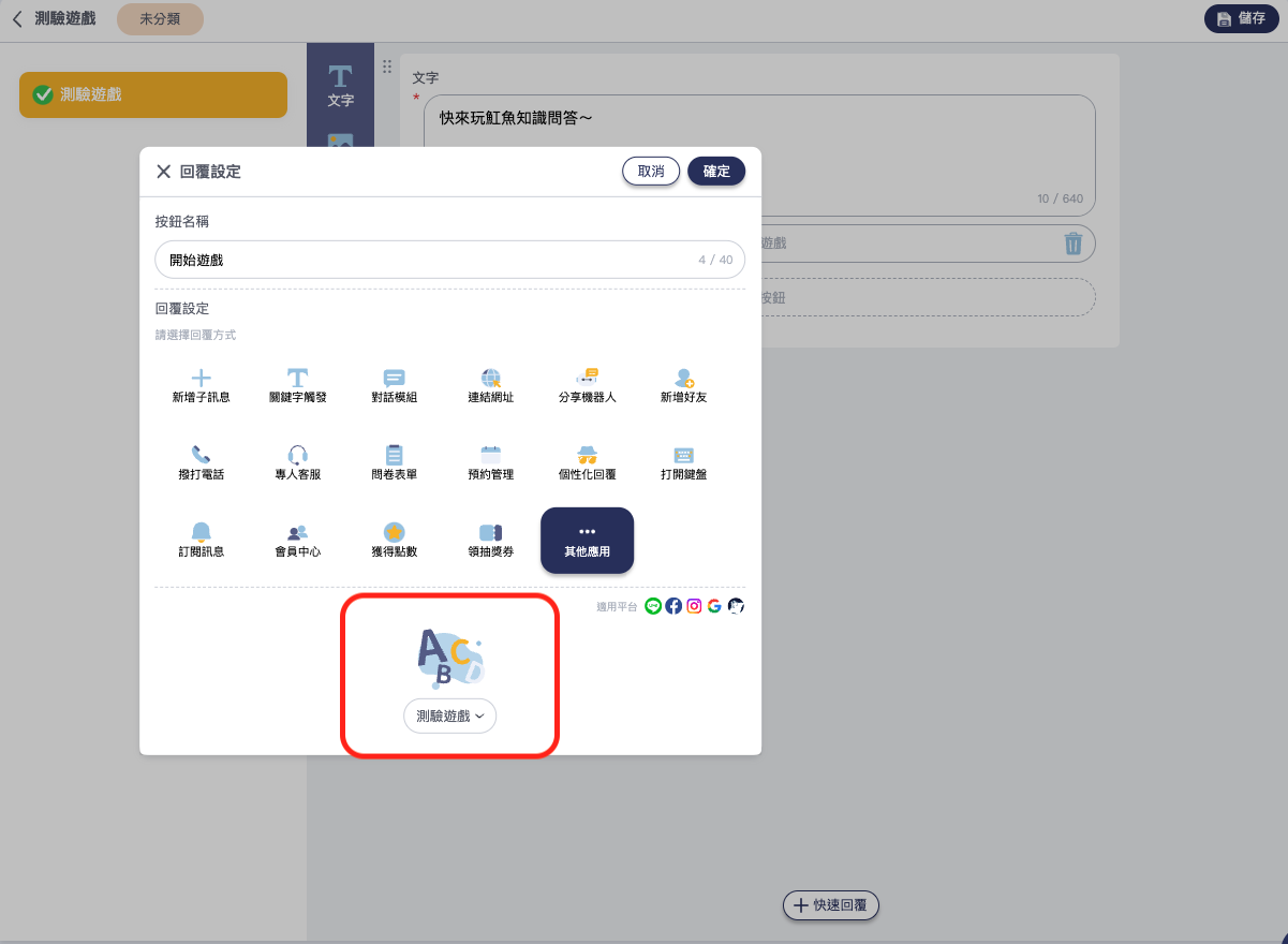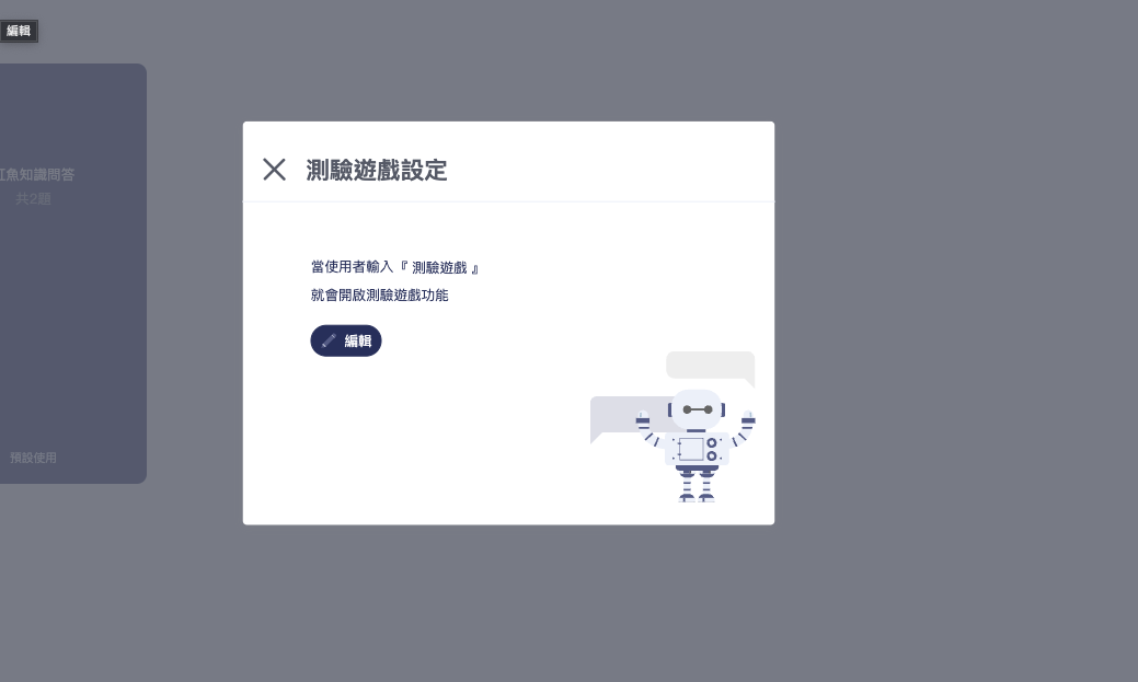 💡 小提醒: 在測驗遊戲列表中，可以透過「測驗遊戲設定」，設定在聊天機器人中使用者輸入的文字，會開啟/關閉測驗遊戲的功能喔！