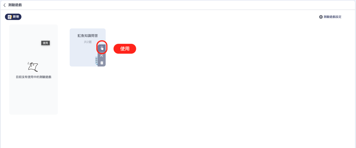 設定完後，回到測驗遊戲的列表中，將滑鼠移至預使用的測驗遊戲，按下「使用」的按鈕。