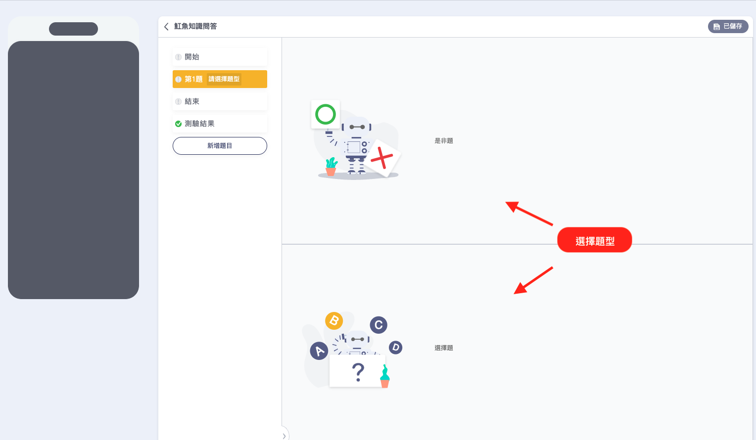 進入編輯題目第一題，在編輯前需要先選擇「是非題」或是「選擇題」。