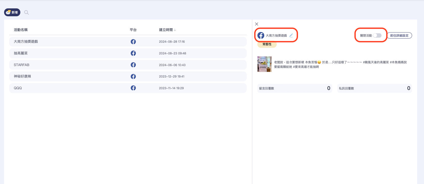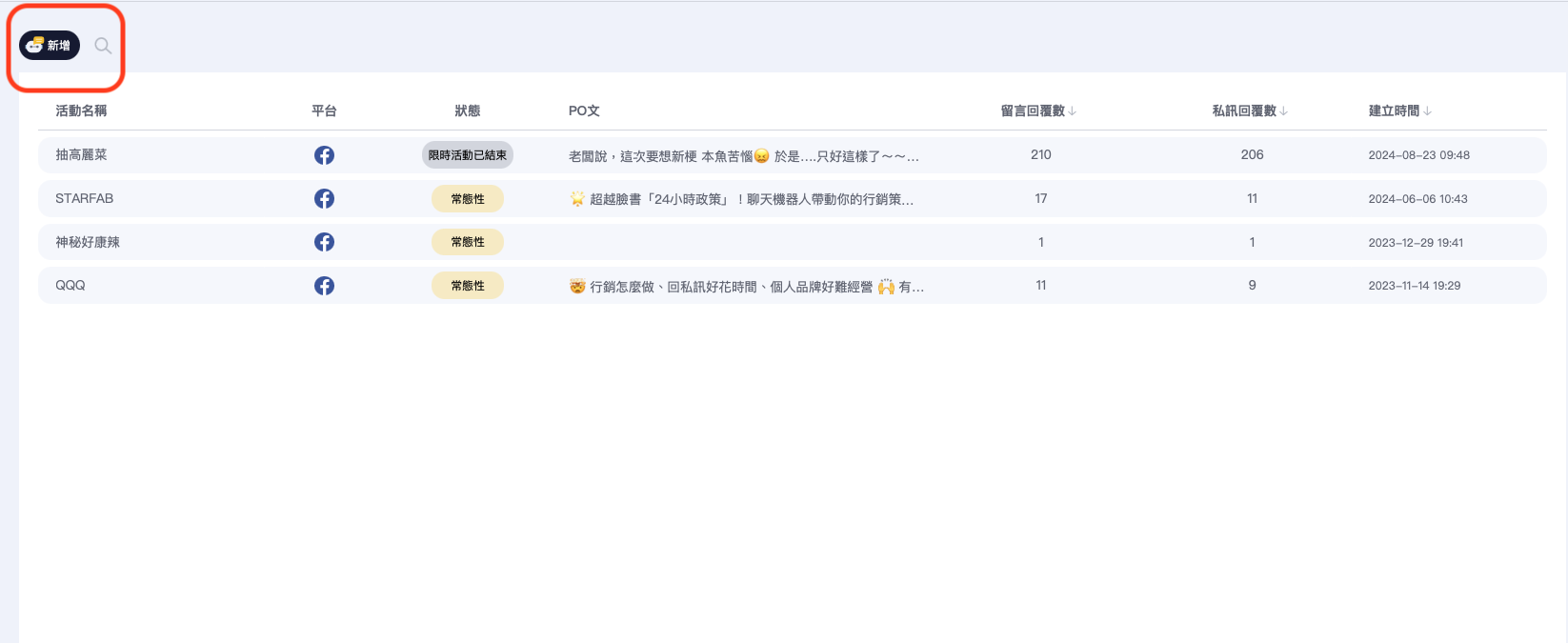 左上角按下新增，中間會儲存已建立好的貼文回覆設定